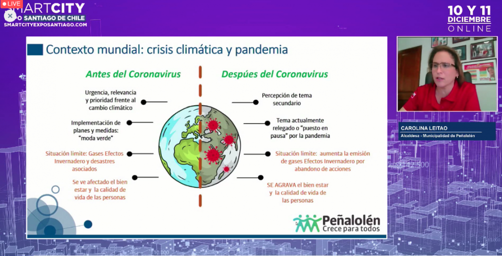 Por esta razón, Peñalolén fue invitado a participar del panel de conversación por su trabajo en la materia y las diferentes distinciones que ha recibió la comuna sobre eficiencia energética y sustentabilidad. En la exposición participaron Maisa Rojas, Climatóloga del Centro para la Ciencia del Clima y la Resilencia, Nicolás Prego, Director Técnico y de Marketing de Smart & Resourceful Cities y la Alcaldesa Carolina Leitao.