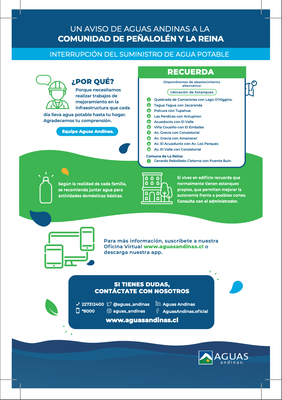Asimismo, la empresa de servicios medioambientales recalcó que para mitigar los inconvenientes que puedan ocasionar estas obras, dispondrá de 11 puntos para abastecimiento alternativo para la ciudadanía (diez en Peñalolén y uno en La Reina), ubicados en las siguientes direcciones: