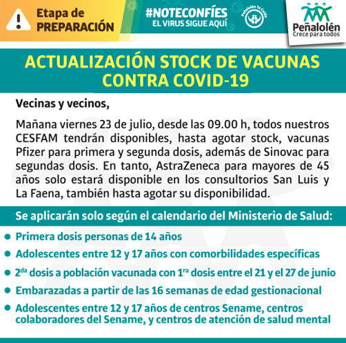 Vecinas y vecinos, compartimos la información sobre las dosis que tendremos disponibles MAÑANA VIERNES 23 DE JULIO desde las 09:00 hrs. hasta agotar stock.