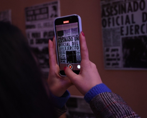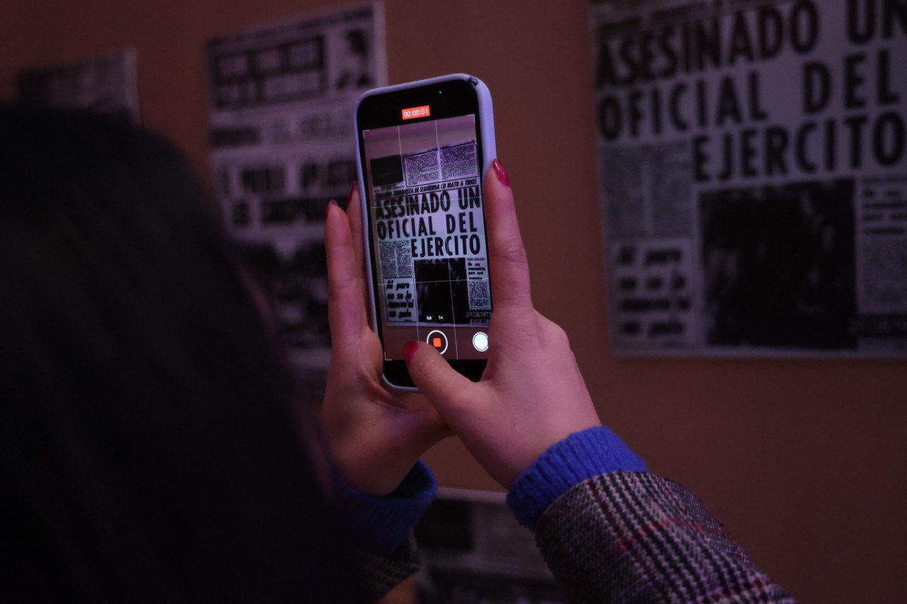 La muestra -en la Biblioteca Grecia- comienza con un panel de portadas de diarios previos al golpe del 11 de septiembre, dando cuenta de la polarización que se reflejaba a través de de la prensa, para luego dar paso a los momentos más significativos como el último discurso de Salvador Allende, la quema de libros, muerte de Víctor Jara y paso a la clandestinidad de algunos cantautores nacionales. Cada sector de la muestra es guiada por un audio, que el visitante descarga a través de un código QR disponible