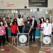 Con una ceremonia desarrollada en el auditorio del Centro Comunitario de Salud Mental (COSAM) perteneciente al SAPU de La Faena, esta tarde la comuna de Peñalolén, a través de la Corporación Municipal, recibió de manos de la Asociación Chilena de Seguridad (ACHS) la distinción y “Sello COVID” para los seis consultorios de la comuna por cumplir con todos los protocolos sanitarios establecidos por el Ministerio de Salud en el combate a la pandemia. Con esto Peñalolén, que ya había recibido el mismo sello pero en los 15 colegios municipales, se convierte en la primera comuna de Chile obtener ambos reconocimientos.