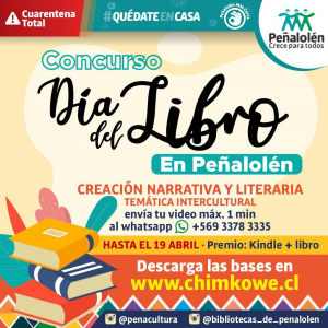 El próximo 23 de abril se celebra un nuevo día internacional del libro y en el marco de estas celebraciones Corporación Cultural de Peñalolén en conjunto con la Unidad de Bibliotecas y la Corporación Municipal de Peñalolén invitan a toda a comuna a participar de un entretenido concurso literario de creaciones y narraciones.