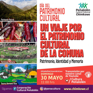 Hoy domingo 30 de mayo, desde las 11 de la mañana, en Peñalolén celebraremos el día del Patrimonio Cultural de manera online, producto de la pandemia del Covid-19. Para la ocasión la Corporación Cultural de Peñalolén tiene preparado un programa dedicado a destacar el Patrimonio, Memoria e Identidad de la comuna, con una ruta por distintos sitios patrimoniales o de memoria con importancia a nivel nacional de la comuna.