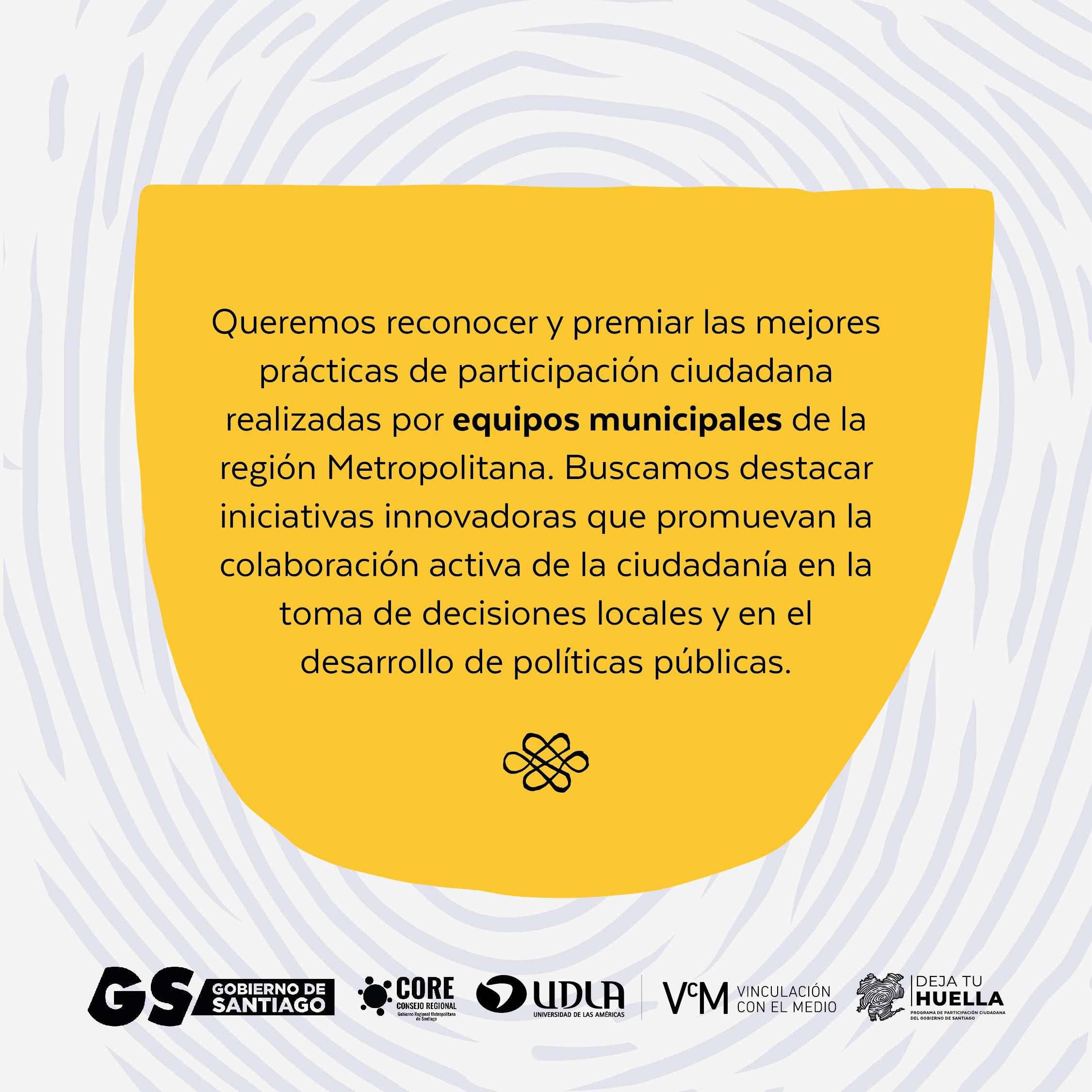 Con el objetivo de mejorar la gestión pública y contar con programas sociales y proyectos de inversión que cuenten con mecanismos de participación ciudadana en la Región Metropolitana, el Gobierno de Santiago lanzó el programa “Deja tu Huella”. Este proyecto, implementado en las 52 comunas de la región, se enfoca en potenciar la participación en todo el ciclo de vida de los proyectos, incentivado a la ciudadanía a ejercer su derecho de incidir en políticas públicas.