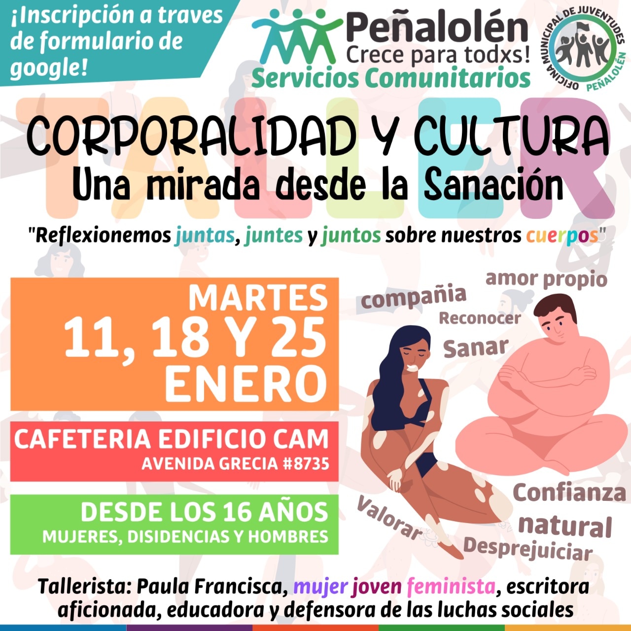 , que tiene por objetivo reflexionar en torno a nuestra corporalidad. El taller está dirigido para mujeres, disidencias y hombres jóvenes desde los 16 años que estudien, vivan y/o trabajen en la comuna.