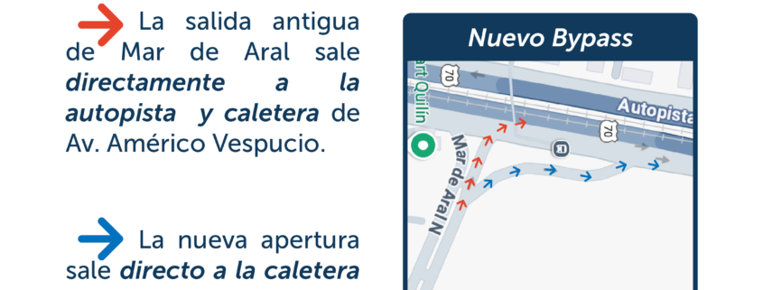 Con este nuevo acceso, los vehículos que transiten por Mar de Aral Poniente podrán incorporarse directamente a la caletera de Américo Vespucio, sin posibilidad de ingresar a la autopista. Por otro lado, la antigua salida de Mar de Aral mantiene su conexión directa a la autopista, lo que descongestionará la ruta, diversificando el tránsito según la necesidad de los conductores.