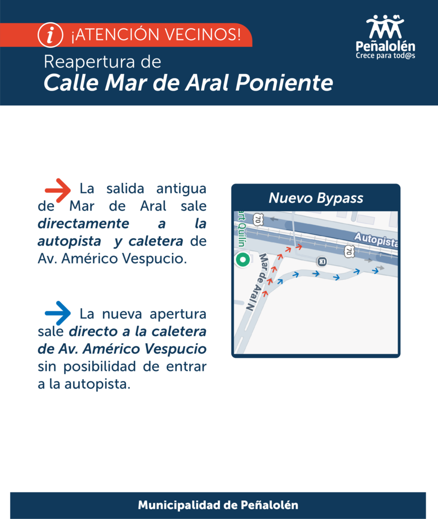 Informamos a la comunidad que ya se encuentra habilitada la nueva conexión de Calle Mar de Aral Poniente con Avenida Américo Vespucio, tras la finalización de las obras ejecutadas por la empresa Crillón.