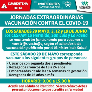 Para poder llegar a todos los vecinos y vecinas que no han podido vacunarse durante la semana, hoy sábado 29 de mayo, se realizará una jornada extraordinaria de vacunación contra el Covid-19 en Peñalolén entre las 9.00 y las 15.00 horas en los Cesfam Lo Hermida, La Faena y San Luis.