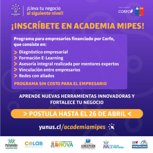 Hoy 26 de abril se cierran las postulaciones para la “Academia Mipes”, que es un programa un formación para emprendedores liderado por la Corporación Yunus de la Municipalidad de Peñalolén e impulsado por Corfo, que permitirá, a través de diferentes estrategias de reactivación de negocios, aumentar la competitividad de micro y pequeñas empresas locales y regionales desde un enfoque sostenible.