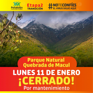 La Alcaldesa recordó que este lunes 11 el Parque continuará cerrado, como todos los lunes por mantención y limpieza, esperándose que desde el martes 12 de enero el recinto pueda abrir sus puertas para recibir público si es que la autoridad sanitaria no dispone otra cosa en el marco de la pandemia por Covid-19.