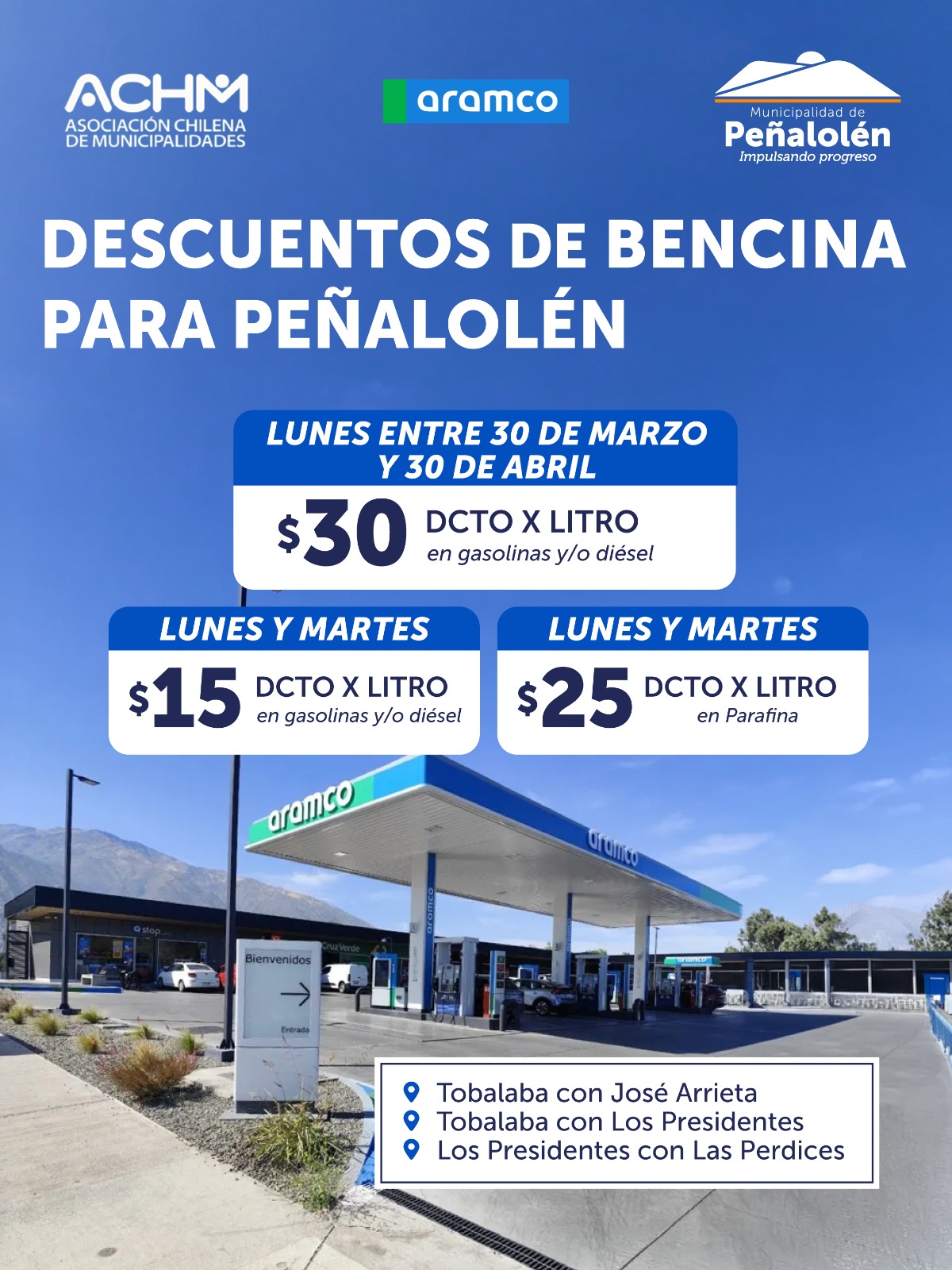 La Municipalidad de Peñalolén adhirió a una iniciativa impulsada por la Asociación de Municipalidades de Chile (AMUCH) que beneficiará a los vecinos de la comuna con descuentos por litro en bencina, diésel y parafina en Aramco. Esta buena noticia forma parte de un esfuerzo conjunto entre municipios del país para entregar un alivio concreto a las familias frente al alza de los combustibles.