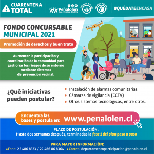 Iniciativas como instalación de alarmas comunitarias, cámaras de vigilancia, adquisición de kit recreativos o juegos familiares, tecnología para mejorar la conectividad, talleres recreativos, entre otros, son algunas de las temáticas que las organizaciones y personas jurídicas, sin fines de lucro de la comuna, podrán postular para promover la participación democrática, equitativa y corresponsable de la comunidad en el desarrollo y ejecución de iniciativas sustentables que apunten al fortalecimiento del capital social y de la inclusión social de los habitantes de la comuna de Peñalolén.