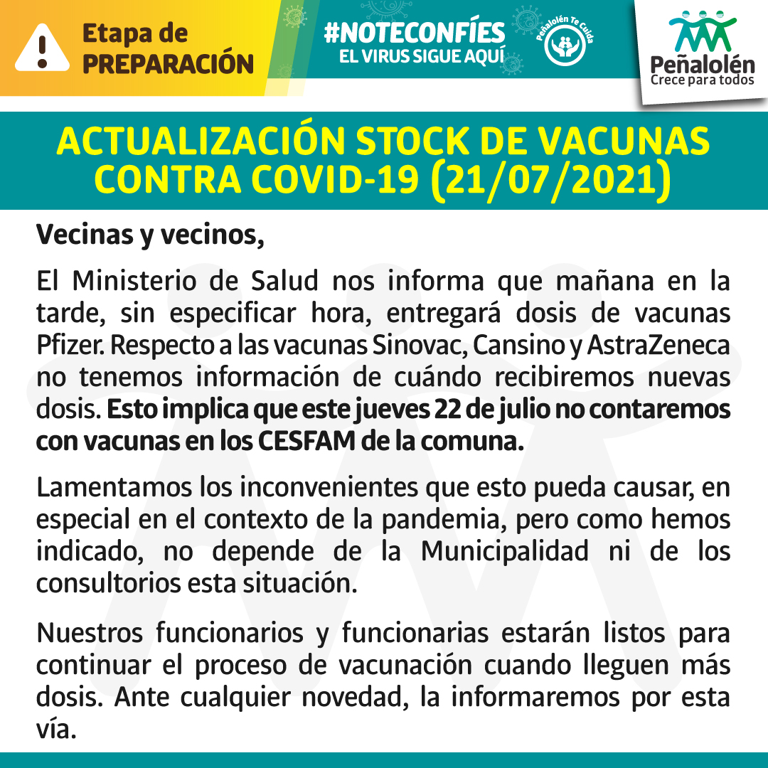 Debido a un problema de stock de dosis de vacunas por parte de Ministerio de Salud, en Peñalolén se deberá suspender la vacunación contra el Covid-19, por lo que todos nuestros centros de vacunación se encontrarán cerrados. Según ha informado la autoridad sanitaria, las dosis llegarán a la comuna durante la tarde, pero no se ha especificado hora ni cantidad.