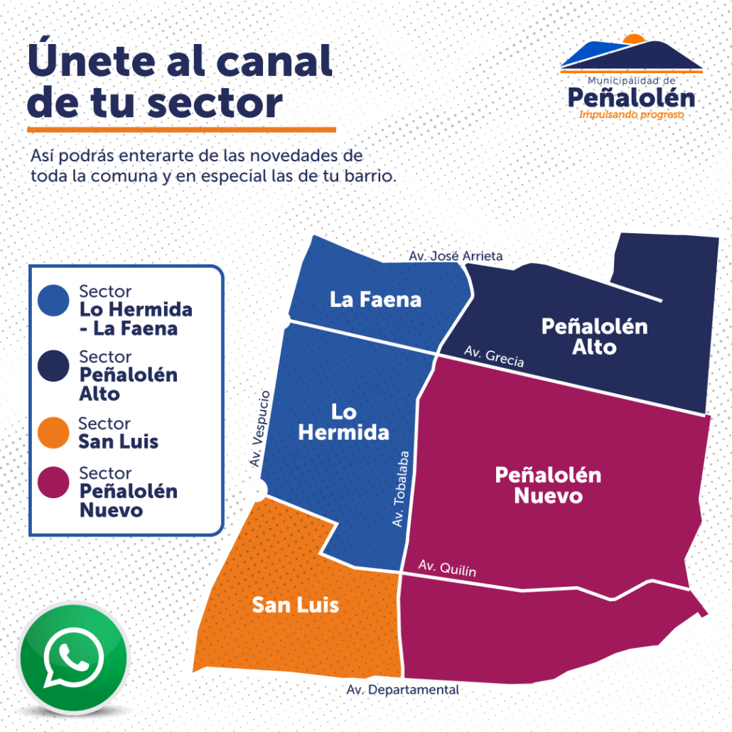 Estos canales están divididos en cuatro macrosectores de la comuna. Cada persona debe ingresar al grupo de su sector, así podrá informarse de las noticias generales de Peñalolén y también de las relacionadas a su barrio.