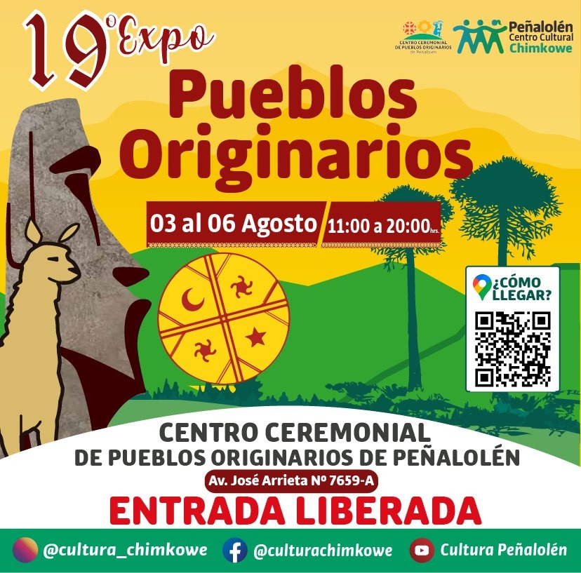 El Centro Ceremonial de Pueblos Originarios se ubica en Avda. José Arrieta 7659-A, Peñalolén. La entrada es liberada y el horario de la Expo será entre las 11:00 y 20:00.