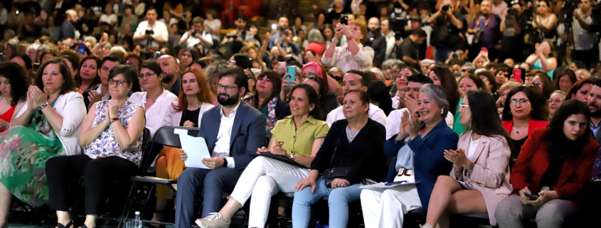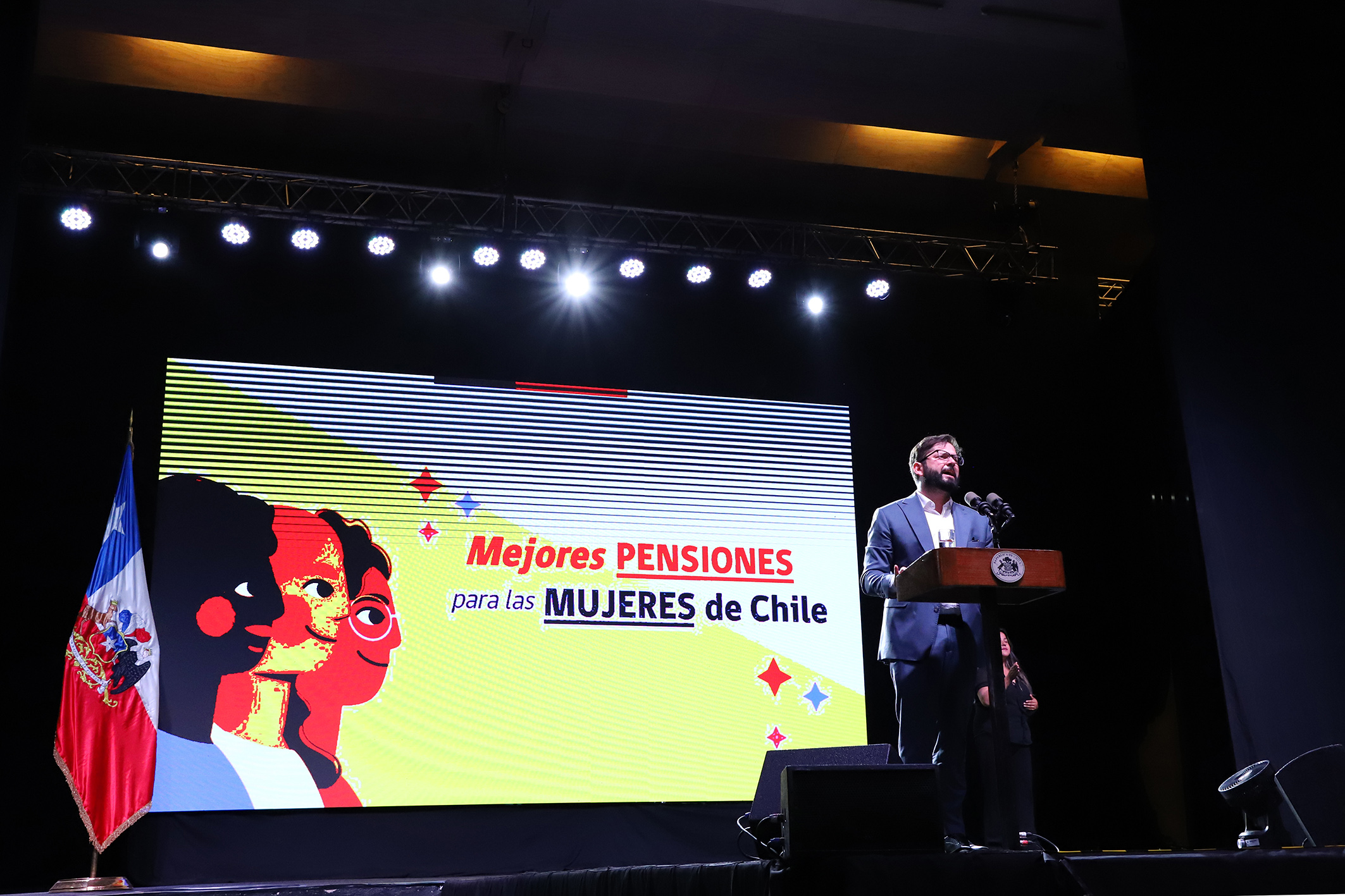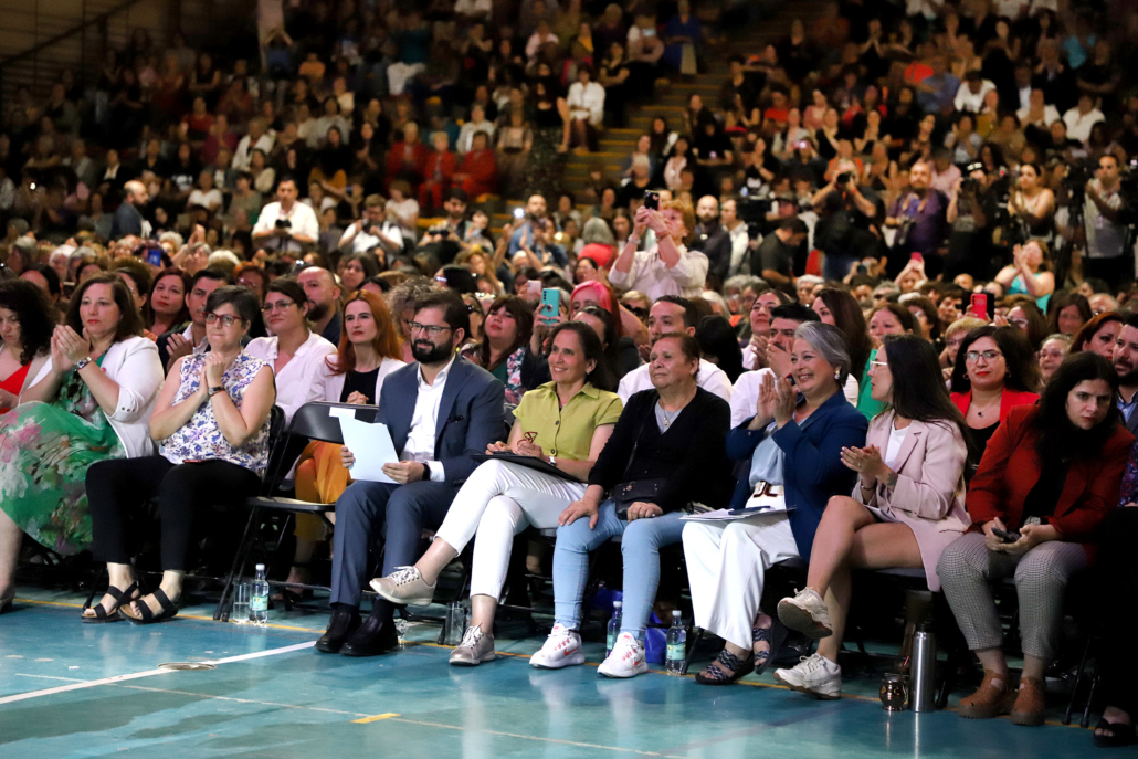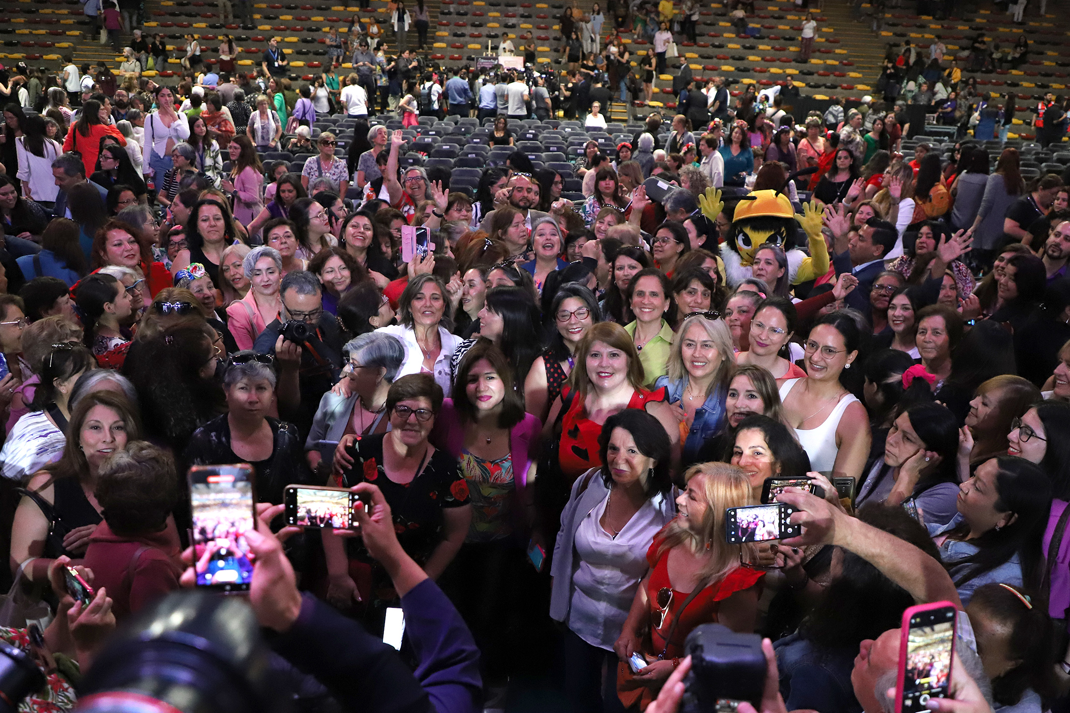 Miles de mujeres de distintas comunas de la Región Metropolitana llegaron hasta el Centro Cultural Chimkowe de Peñalolén para participar del conversatorio “Mejores Pensiones para las Mujeres de Chile”. Allí el presidente Gabriel Boric, junto a las ministras del Trabajo, Jeanette Jara; de la Secretaría General de Gobierno, Camila Vallejo; de la Mujer y Equidad de Género, Antonia Orellana y de Bienes Nacionales, Marca Sandoval; además de la ex presidenta Michelle Bachelet, conversaron con las asistentes sobre los alcances del Proyecto de Reforma a las Pensiones del Gobierno que considera un 6% de cotización adicional.