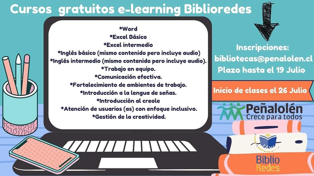 Biblioredes y Bibliotecas de Peñalolén invitan a la inscripción a distintos cursos e-learning 2021. Estos cursos son gratuitos, certificado y abiertos para toda la comunidad. Los únicos requisitos son tener más de 18 años, correo electrónico y conexión a internet.