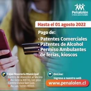 Entre el 01.07.2022 al 01.08.2022, usted podrá realizar el pago de las patentes y permisos, ingresando a nuestra pagina www.penalolen.cl banner pago patentes comerciales o vía presencial en cajas de nuestra Tesorería Municipal, ubicadas en el Centro Cívico y Culturala San Luis, Av Las Torres N° 5555 y en Edificio Consistorial, Av. Grecia N° 8735 piso 1, edificio CAV.
